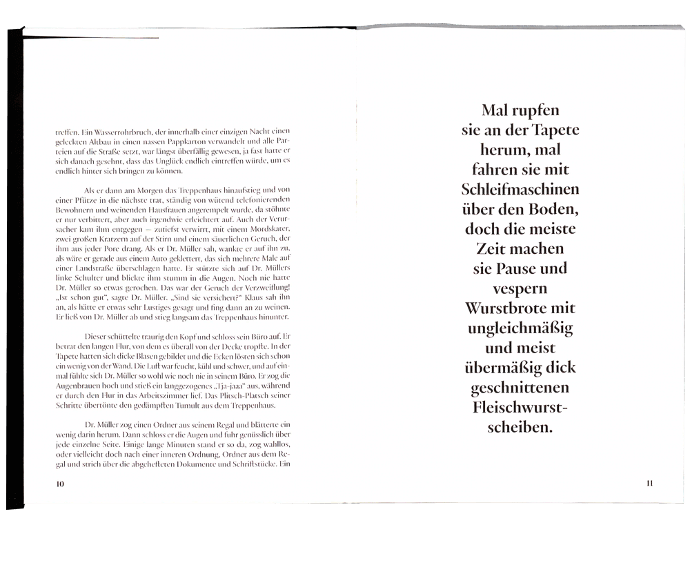 Aus dem Fenster sieht er in sein altes Büro, durch das täglich Handwerker laufen. Mal rupfen sie an der Tapete herum, mal fahren sie mit Schleifmaschinen über den Boden, doch die meiste Zeit machen sie Pause und vespern Wurstbrote mit ungleichmäßig und meist übermäßig dick geschnittenen Fleischwurstscheiben. Die sieht Dr. Müller ganz genau und er fragt sich wie ordentlich jemand seine Arbeit wohl verrichtet, der schon beim Schneiden der Wurst dermaßen versagt. Dann erklingt aus dem Nebenzimmer das leise Zischen und Klacken der Laminiermaschine und das Husten des neuen Sekretärs und Dr. Müller lehnt sich für einen Moment in seinen Stuhl und lächelt.