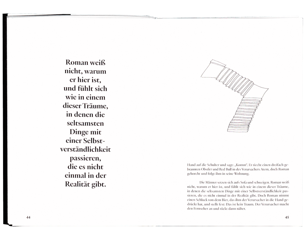 Roman weiß nicht warum er hier ist und fühlt sich wie in einem dieser Träume, in denen die seltsamsten Dinge mit einer Selbstverständlichkeit passieren, die es nicht einmal in der Realität gibt. Doch Roman nimmt einen Schluck von dem Bier das ihm der Verursacher in die Hand gedrückt hat und stellt fest: Das ist kein Traum. Der Verursacher macht den Fernseher an und rückt dann näher.